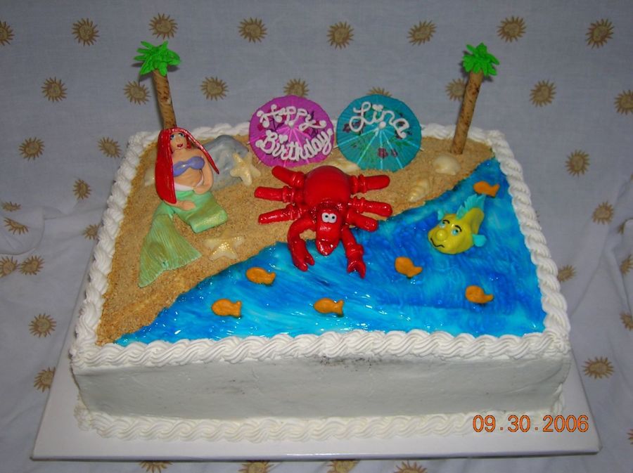 Oops!! Sebastian is kinda big...looks bigger than Ariel (oh well, it was a learning experience)!! Half-sheet double layer with buttercream filling. Ariel, Flounder and Sebastian and rock made with fondant. Palm trees piped with green buttercream using leaf tip. Shells made with melted almond bark and brushed with gold luster dust. Beach made from crushed graham cracker crumbs. Water is colored piping gel. Thanks for looking!