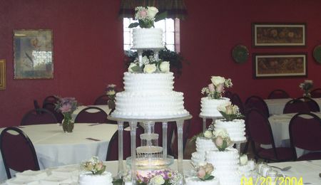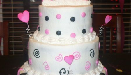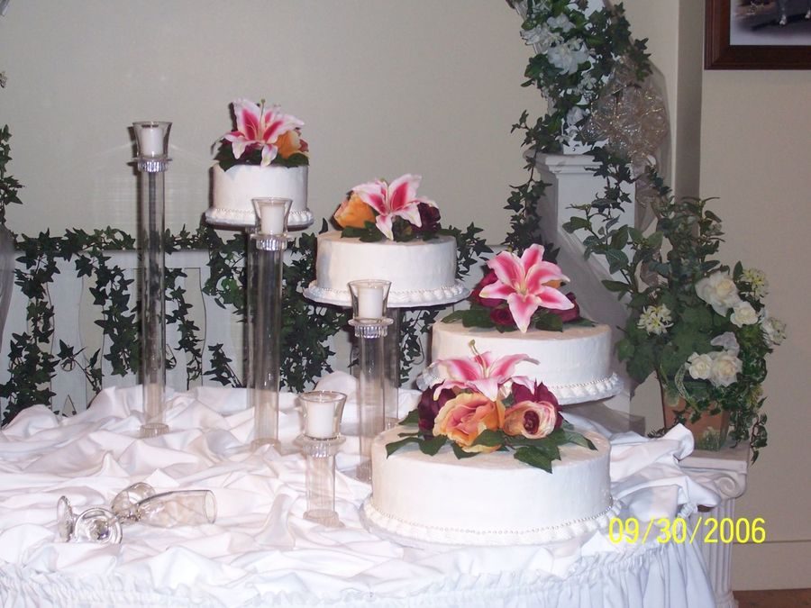 cake is decorated in buttercream icing with non edible pearls around the base of the cake. The flowers are silk.