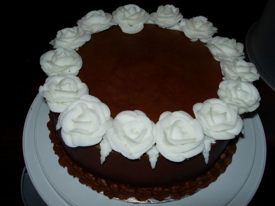 Chocolate frosting with white buttercream roses. I didn't want to do the traditional rose spray so this is what Icame up with.