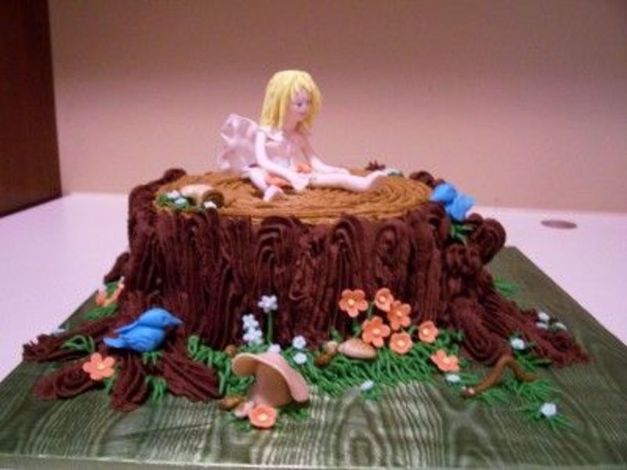 Fondant fairy sits on a deep chocolate cake filled with raspberry preserves and iced in milk chocolate chocolate buttercream. Flowers, birds, mushrooms and snails are fondant and gumpaste.
