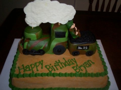 I just did this cake for my son's kindergarten teacher. She said her son was turning 22, worked for the railroad and liked hunting and this is what I came up with. It's covered in CBC, and the train and hunter are mmf and gum paste mixed.