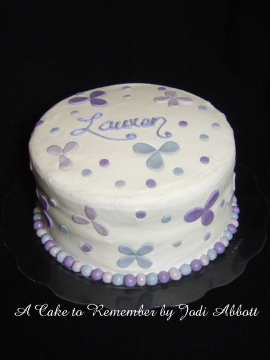 7 inch round caramel cake, frosted in buttercream with fondant accents.