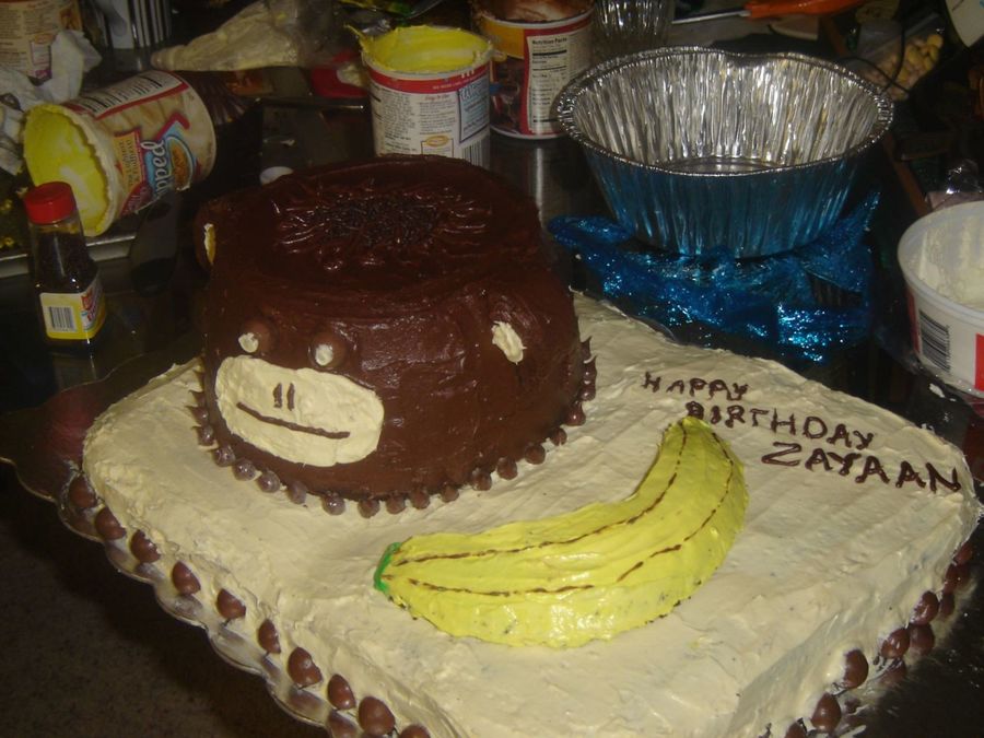 used the basic martha stewart monkey cake idea and added onto it.. excuse the mess. hehe this was my second attenmpt at cake decoration..my son's 1st bday cake..