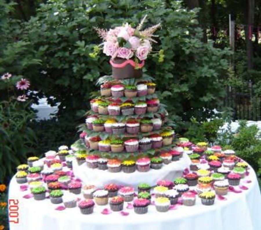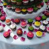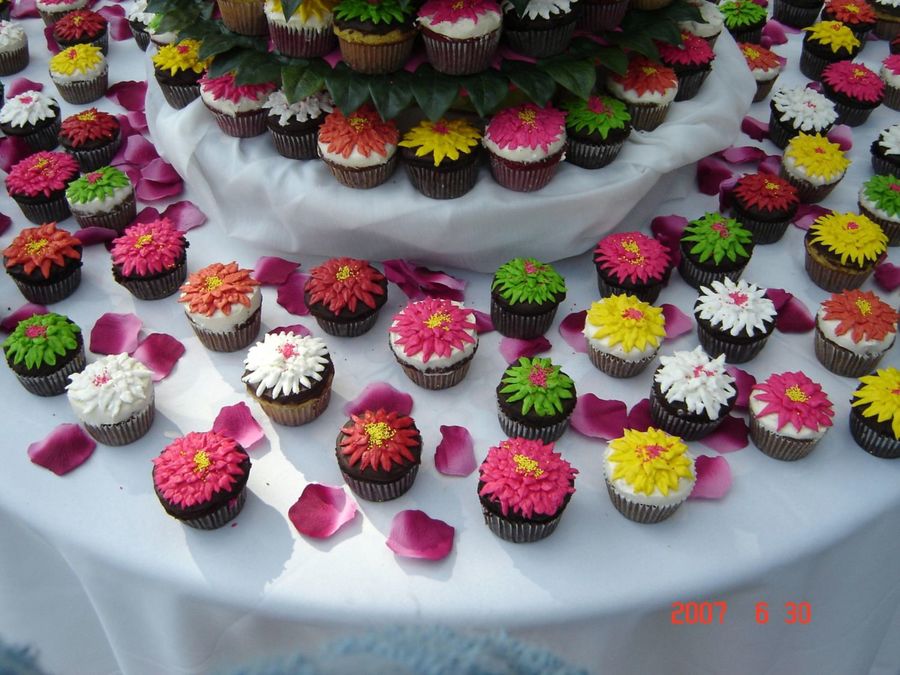 175 cupcakes, 5 flavors, 2 frostings and 175 buttercream flowers, man am I tired! I also made the chocolate covered styrofoam dummy topper with swags of pink fondant.