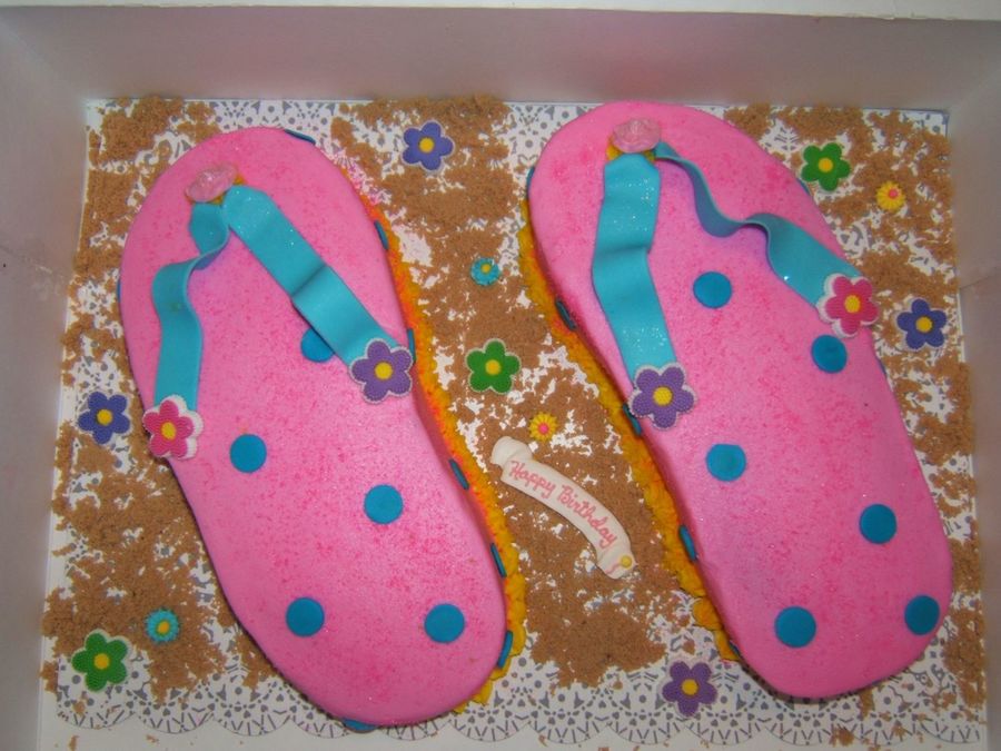 This was a birthday cake for my 7 year old niece, she loved it, i got the idea from another pic from CC. These cakes were cut out by tracing a flip flop on paper then placing that on the cake, the icing is buttercream, the blue straps and dots are fondant, the sand is brown sugar.