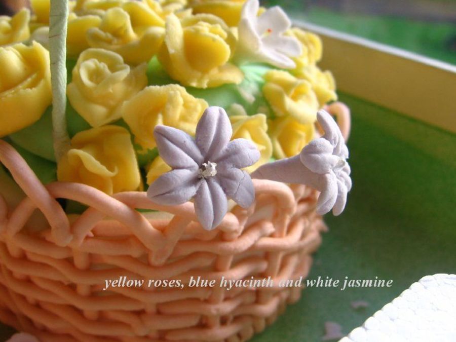 This basket full of flowers I made for my dear friend's birthday last month. The basket is moulded with sugarpaste, and then piped with royal icing, using basketweave. The roses, and leaves are piped from royal icing. The hyacinth and white jasmine were moulded from sugarpaste. I was so thrilled she was happy to receive her basket full.