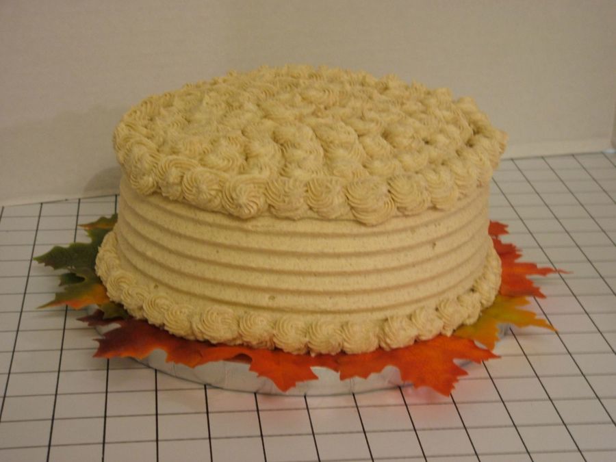 Last minute cake for DIL's aunt, found out at 9:30PM last night! Luckily I had some left over caramel I made last week with sweetened condensed milk boiled in the can. French Vanilla cake torted, cinnamon caramel BC filling and icing. Silk Fall colored leaves slipped under cake before piping the bottom border. Thanks for looking!