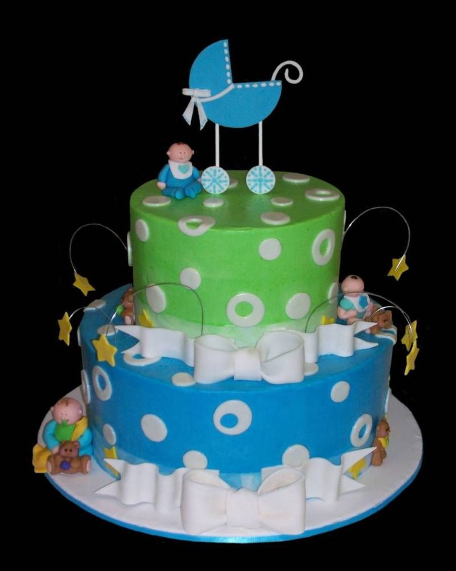 2 tiered baby shower cake (8" chocolate cake on 12" vanilla cake) iced in BC. MMF accents. Fondant carriage and babies. This was my first attempt at modeling babies. Teddy bears were from clay molds. Thanks to all of the wonderful carriage cakes for the ideas!
