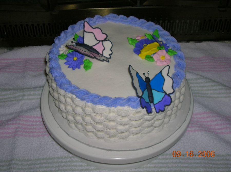Yellow cake with BC frosting, royal butterflies and flowers, basketweave border. I made this for my grandmother's/aunt's birthday. Thanks for looking!