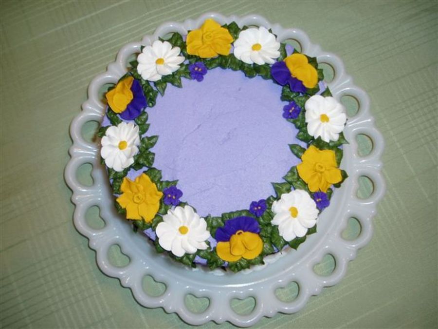 Top view of a cake I made for my women's Bible study potluck. Wanted to try a purple cake - so I made royal icing pansies, violets, daisies and daffodils to adorn it.