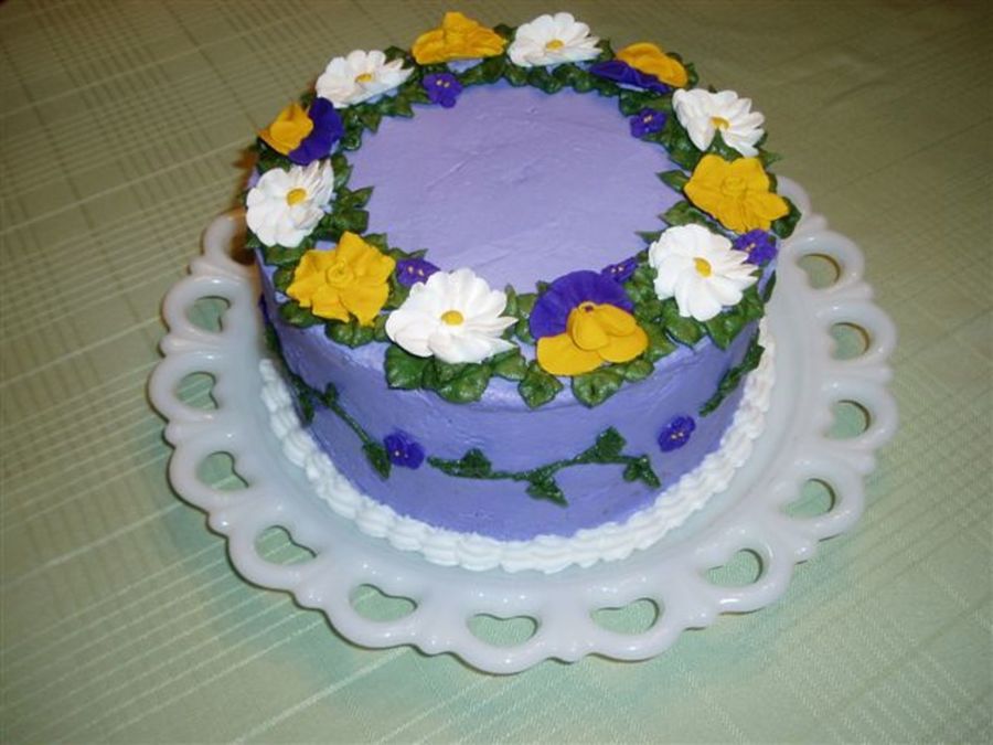 Side/top view of a cake I made for my women's Bible study. I just wanted to make a purple cake! Royal icing flowers.