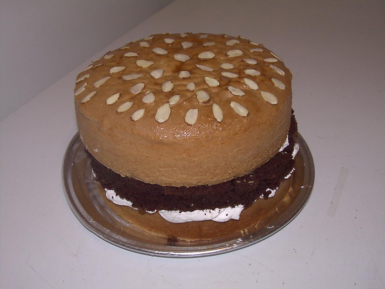 This burger cake is a white cake for the bun with sliced almonds on top to look like sesame seeds. The burger is a brownie and the mayo is white buttercream icing. We served it with raspberry puree and mango puree in squeeze bottles to look like ketchup and mustard.
