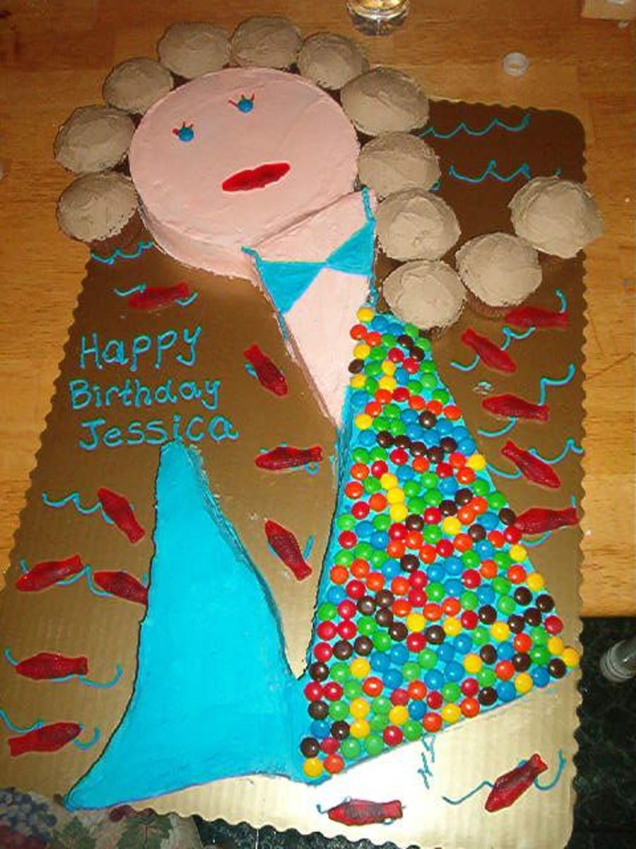 The customer brought me a picture of this cake, and it is HUGE- I have to make it fit on full sheet cake board. The scales are M&M's, the hair is chocolate cupcakes, the fish are Swedish fish, the lips are Swedish fish also. This was a lot of fun to make.