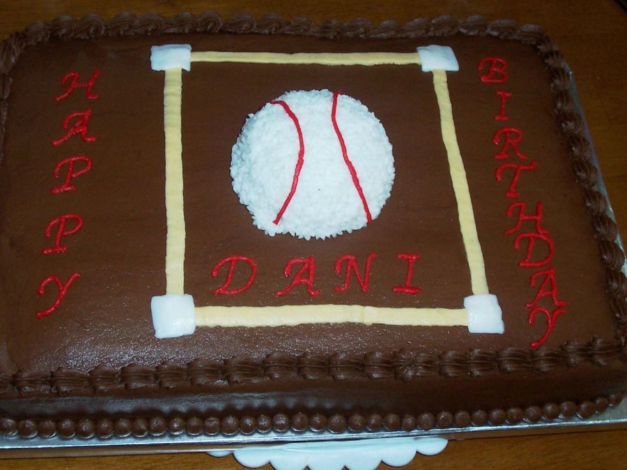 Here is my softball cake. Her dad asked for choc cake with choc icing and a softball theme. As you can tell I am not over flowing with imagination. lol