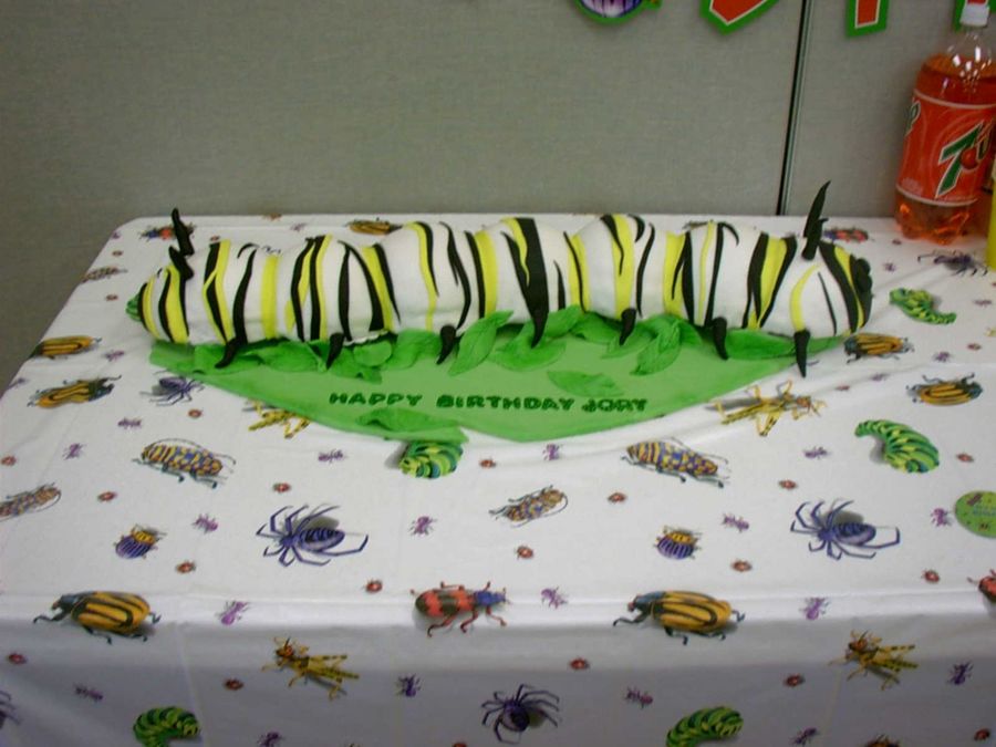 This was for a little boy's bug party. This is his favorite type of caterpillar. The base is foam core board cut to a leaf shape and covered in fondant.