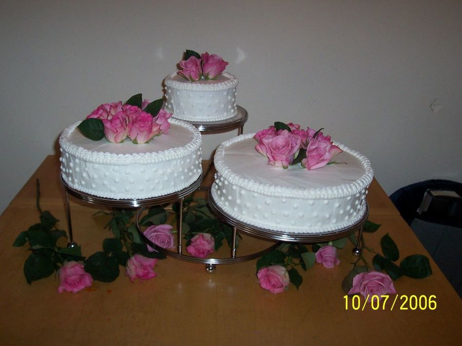 CakeRN on 11 Oct 2006 , 4:36pm Beautiful job. I love the dots on the sides and the pink roses to top it off. Great Double border too.