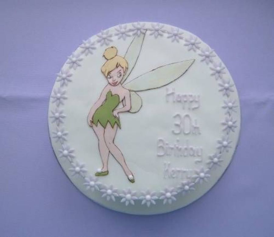 Thanks for all your lovely comments. Kerry is doing well & is responding to her treatment really well. I made Tink by rolling out the sugarpaste very thinly & then cutting out her wings & dress etc & then putting them together like a jigsaw. I then painted her outline with a very fine brush. I also put edible glitter on her wings but it doesn't show up on the picture.