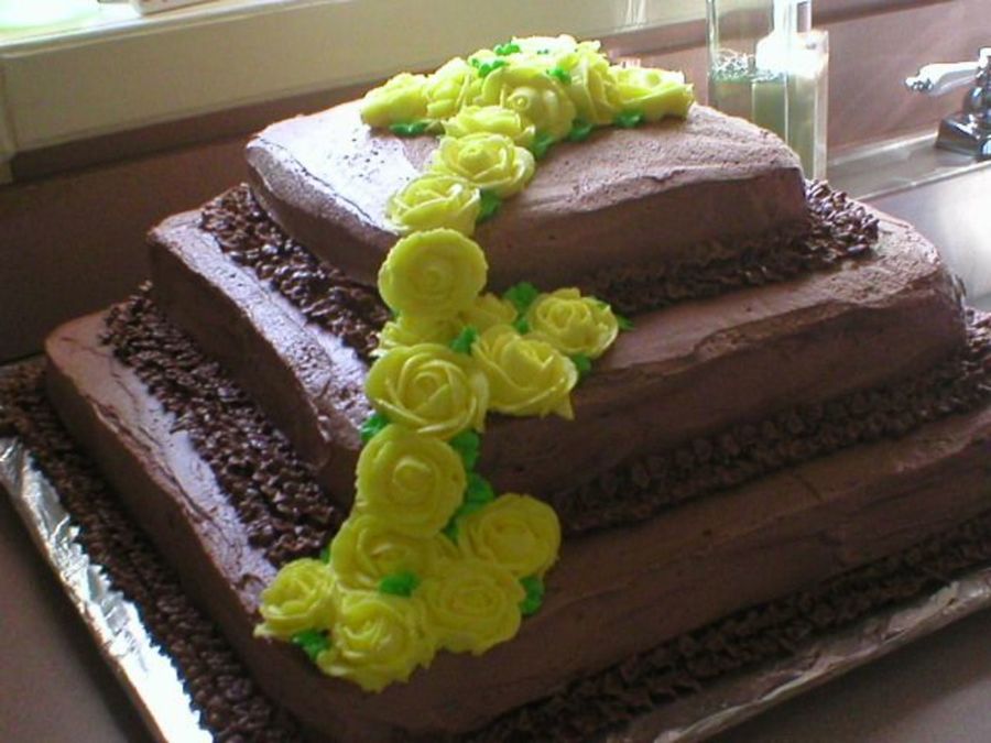 This is the very first cake I made all by myself after Wilton Course 1 class. I didn't volunteer to make it, my cousin forced me! It's chocolate on all layers with chocolate icing and buttercream roses. I was so nervous that the family wouldn't like it, but they did.