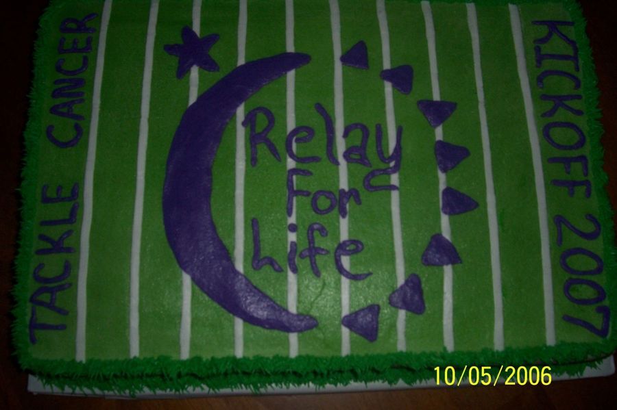 I did this cake for our county wide relay for life kickoff for 2007 year. The theme was tackle cancer. I put goal post on after I delivered. The picture took a little dark but it is purple writing. The colors looked better in life.