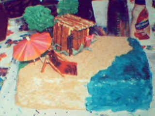 Cake as for my god daughter , IT's a hawaiian theme first time using piping, tiki made out of pretezls. louge chair out of Fruit roll up . to cute
