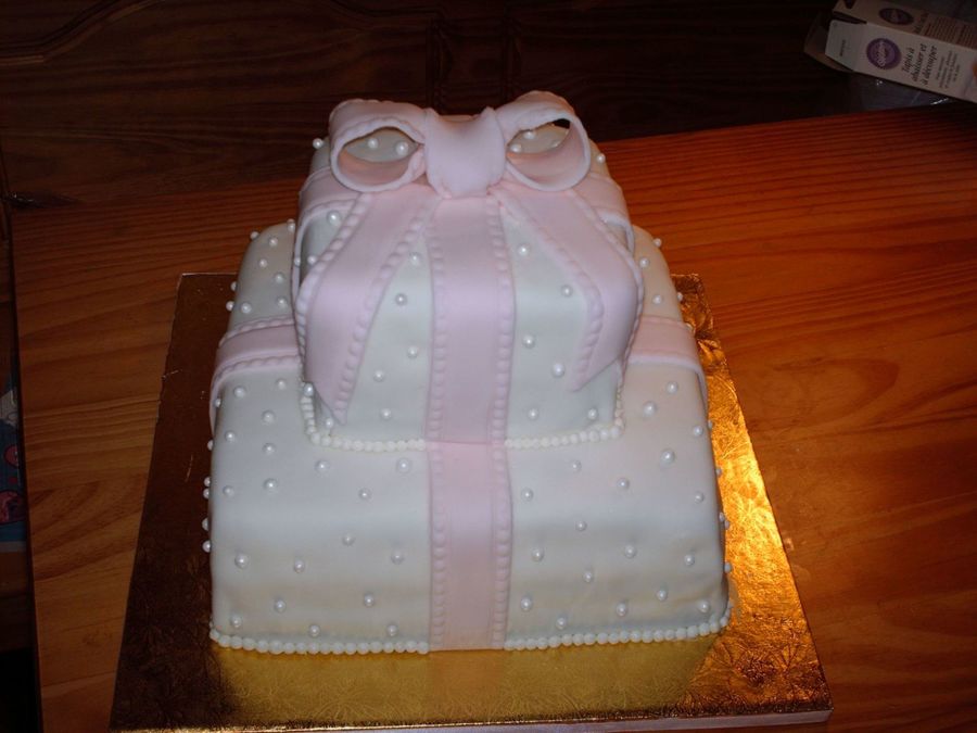 sweetbaker on 13 Oct 2006 , 5:00pm Very pretty. Nice job on covering with fondant and adding the bow and the pearls.