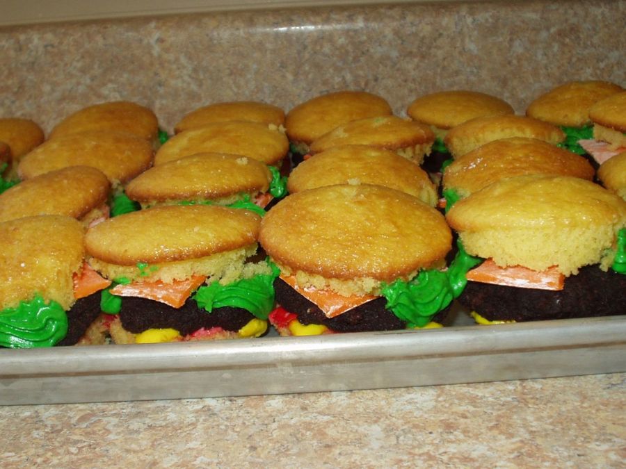 Classic yellow cupcakes, devils food and irish creamer for cake ball patties, green, yellow, and red buttercream, orange fondant for cheese. This was the most fun I've ever had cake decorating! Thanks for all of the great ideas on CC!!!