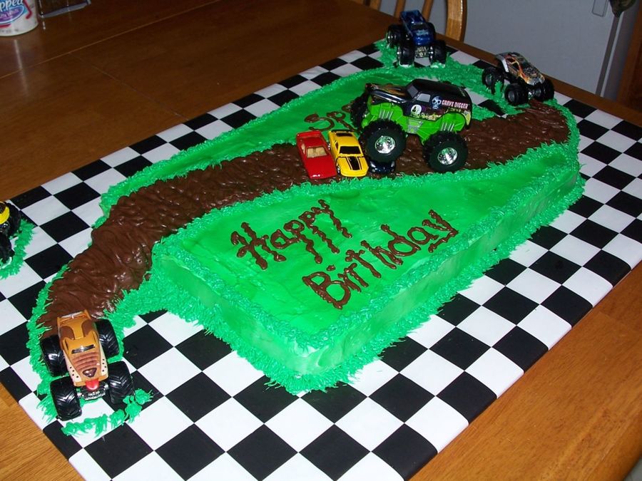 This was my son's 5th B-Day cake. The dirt track is choc. frosting and the grass is white frosting sprayed green. The ramps on the sides are built up with E.L.F sandwich cookies and covered with frosting. All trucks are just toys that I purchased at Walmart.