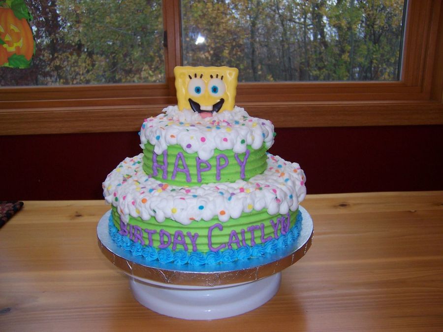 This is my first stacked cake. It's the Spongebob cake from the Wilton yearbook. White almond cake with raspberry cream filling, and buttercream icing. I didn't make the arms because I didn't really have the time and I thought it looked good enough without them!