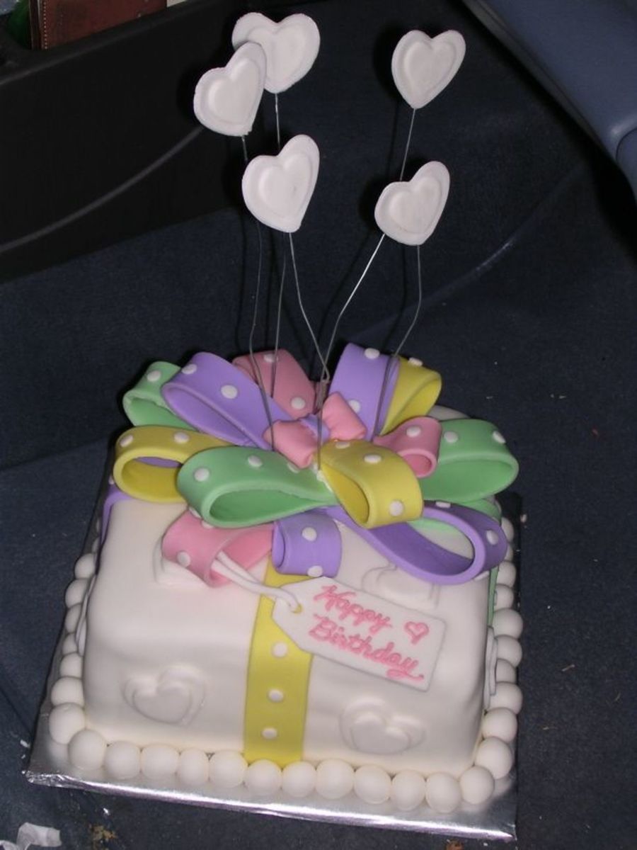 My Present/Gift shaped cake is fondant covered and is decorated with ribbons and bows of fondant. The heart cutouts are on wires. A gift tag completes the cake.