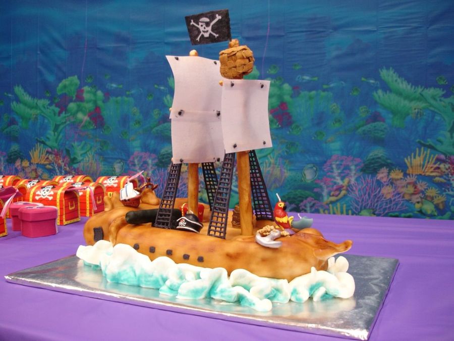 Fondant covered ship has royal icing ropes and wafer paper masts and flag. Most everything is royal icing or fondant (including the waves). The only part you can't eat are the 2 support poles & the 5candles! + Name of Birthday Kid was on the Back of the Ship in Gold.