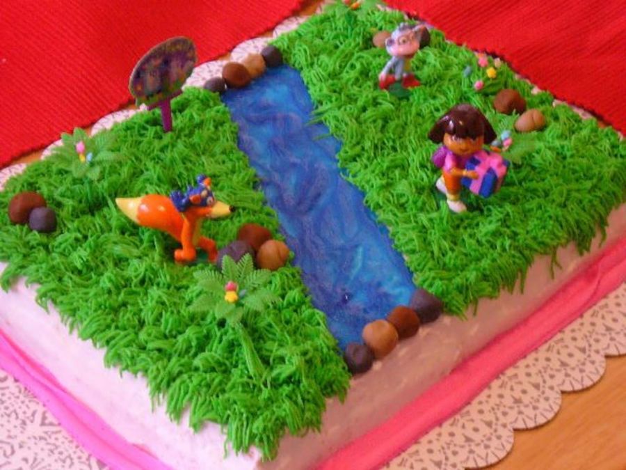I did this cake for a neighbor's daughter. It is a banana creme cake with strawberry filing. The figures are store bought and the rocks are fondant. I used Wilton sparkle gel for the water. Thanks for looking.