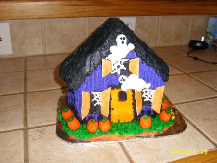 My first stand up cake. All BC frosting with sticks of gum smeared with BC frosting for the shutters. Pumpkins are candy.