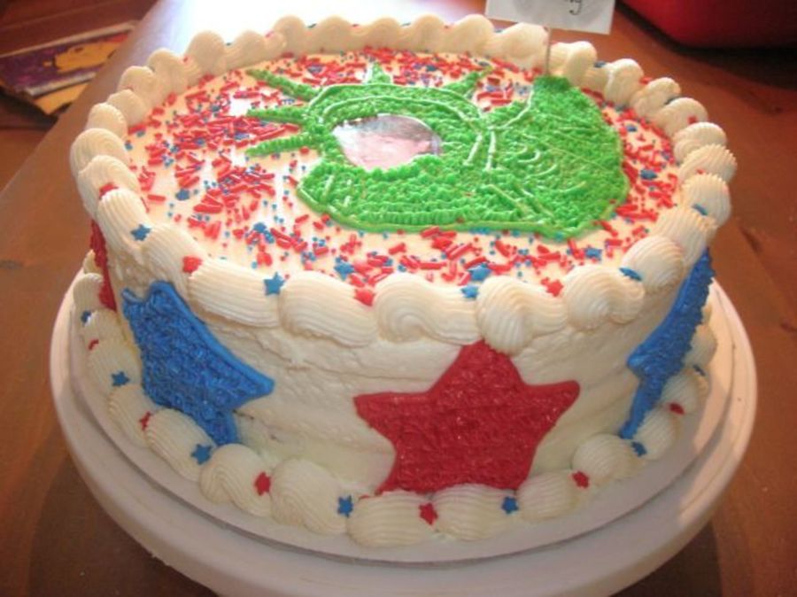 A birthday cake for a coworker born on the 4th of July. Chocolate two layer cake with raspberry filling and buttercream icing. I put her picture on the Statue of Liberty.