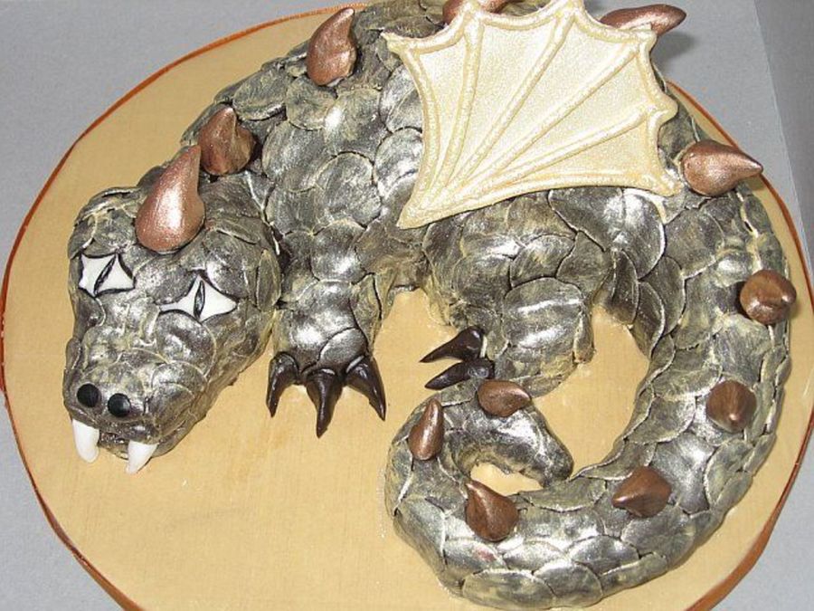 Thanks everyone! It's chocolate MMF (only because I had already had some made!) that I painted (hence the outline look). It took just a jar of dust, and not even the whole jar (it was actually Wilton's pearl dust). The little boy wanted a gold dragon!