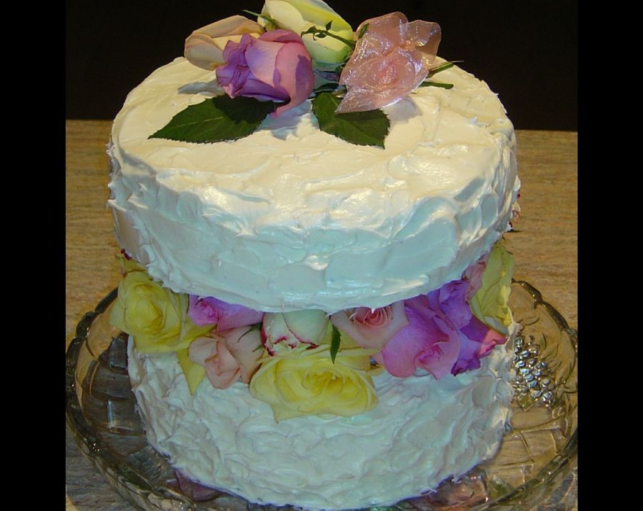 The two chocolate mud cakes were iced with vanilla frosting and joined with a wreath of fresh roses. A small bouquet was added to the top for a finishing touch.