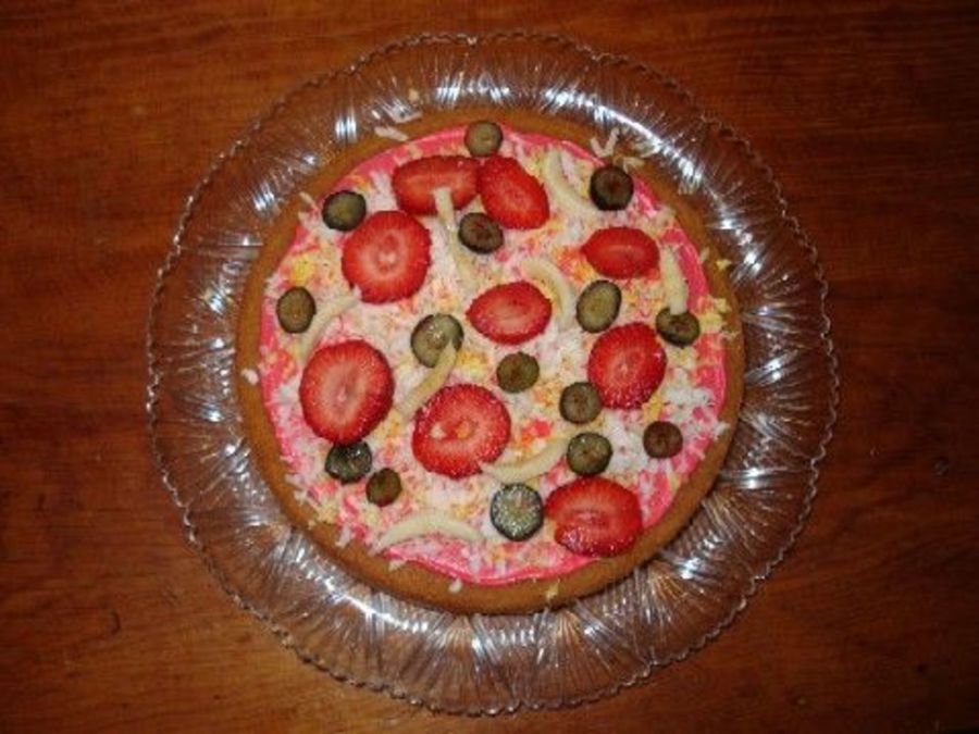 Pizza cake - the cheese is coconut w/ food coloring, Pepperoni is strawberries, onions are banana, olives are blueberries.