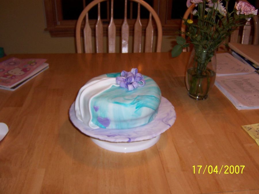 this was my first try at fondant and as you can see its not perfect, although it might have been better if i had trimmed the sides of the cake, pretty sure i won't make that mistake again.