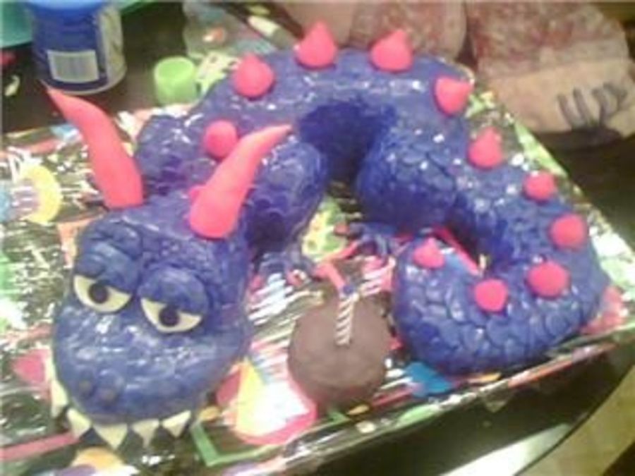 I made this for my husband's birthday. This was the first time I've attempted a carved cake. It was actually much easier than I anticipated it to be, but it was pretty time consuming. The scales are rolled buttercream, the horns, eyes,spieks, etc. are mmf. The scales took about 2 hours to cut out and apply! It was fun, but it was a little sad seeing him all cut up...kind of like seeing a stuffed animal mutilated! Still, he was delicious!