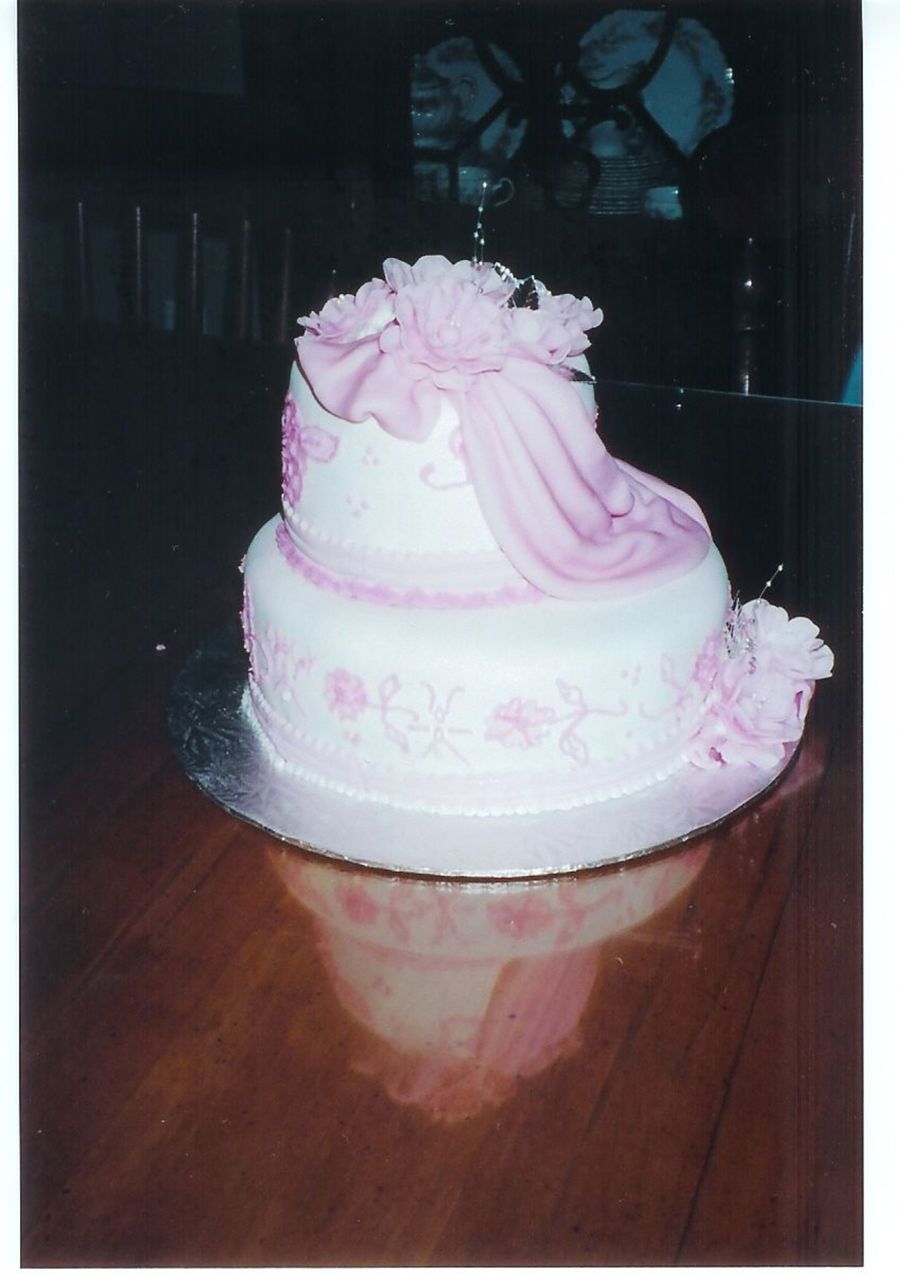 Fondant covered cake with a swag and fondant flowers. Embroidered flowers around the cake with royal icing. This cake is lemon cake with vanilla buttercream filling and crumb coat. Kathy