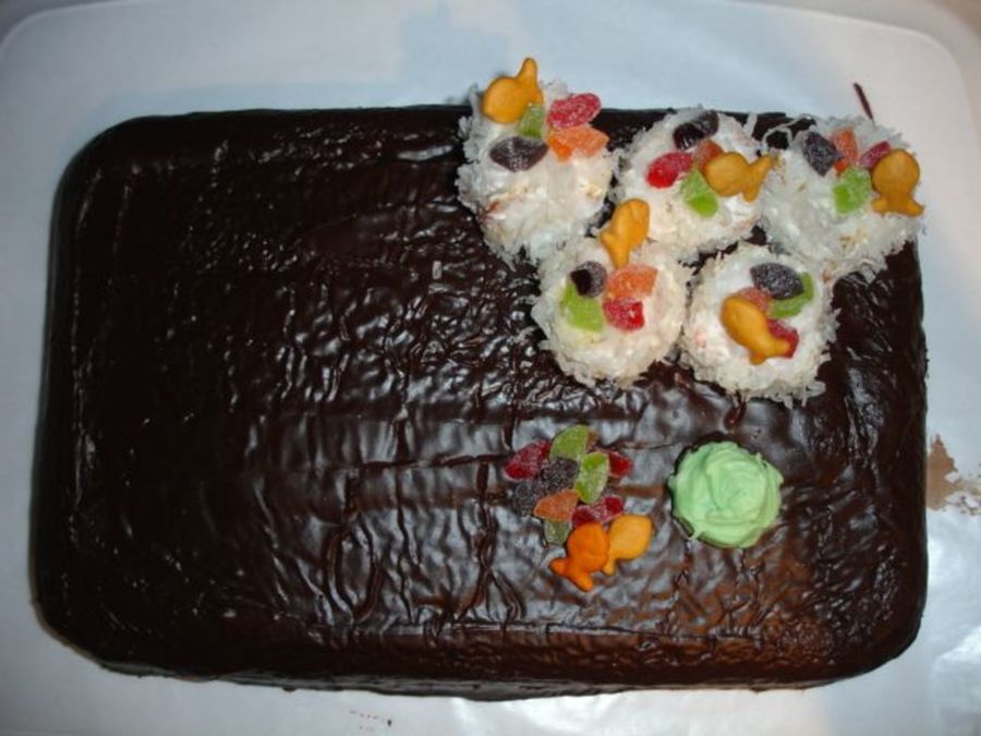 Coconut cake with twinkies wrapped in coconut shreds topped of with gummy candy. Thanks to all the members on CC who did this cake and gave me this idea. Thanks for looking!