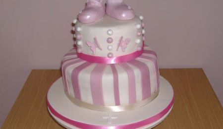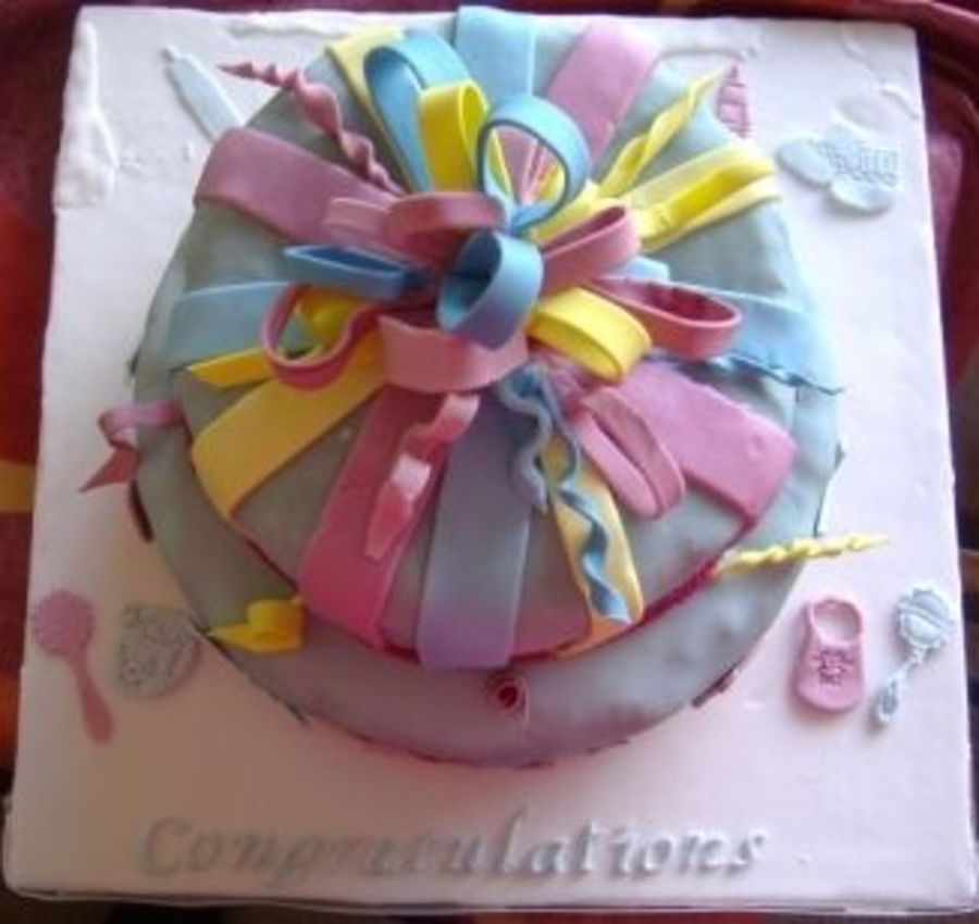 A fun, colourful cake ... love your ribbons, and baby shapes!