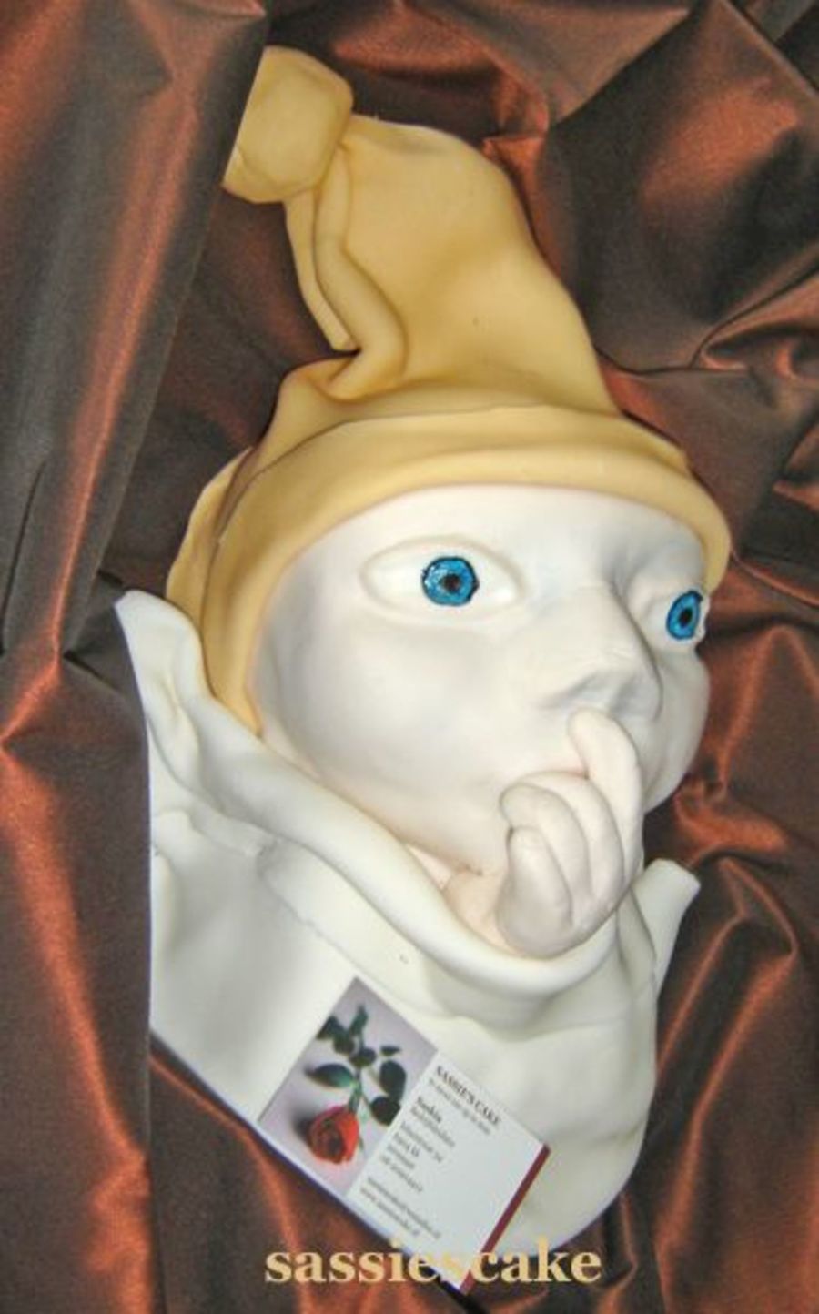 This is the first ever "facial" cake i have made. Hopefully it looks like a baby's face..... Only the baby's sleeping hat is sugarpaste the rest is cake covered with sugarpaste. It's a chocolate cake with cherry filling. This is not an assignment but something that i had to make, it just came up spontaniously..... please feed me with your comments.......