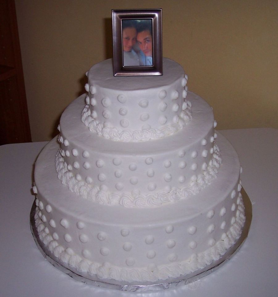 This was my first wedding cake. It is a white cake with rasberry filling and vanilla buttercream decorated with swiss dots.
