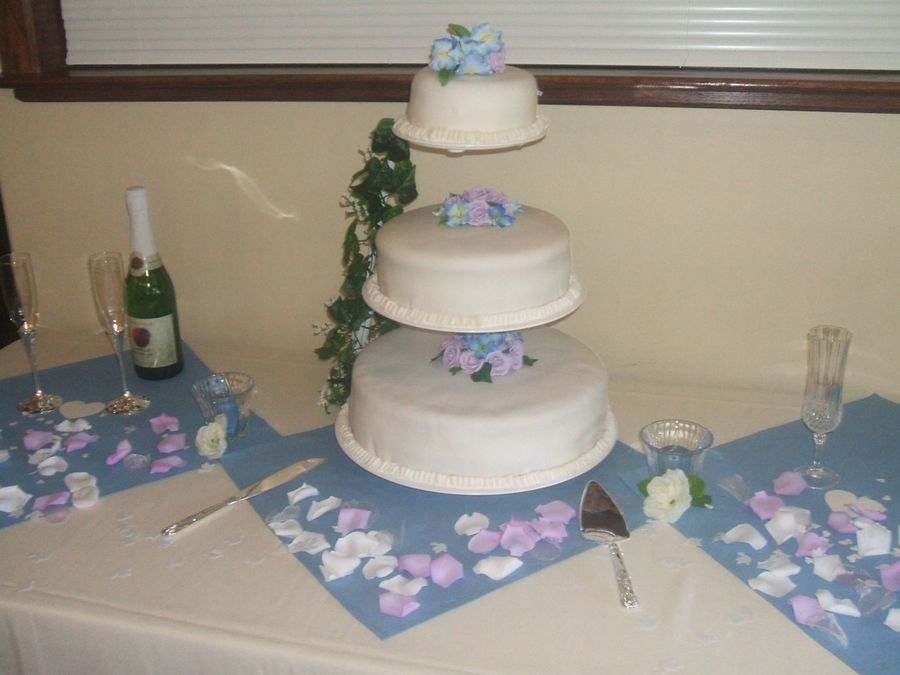 chocolate cake with bavarian cream, vanilla cake with strawberry and choccolate cake with strawberry all covered in fondant with roses, irises and mixed flowers