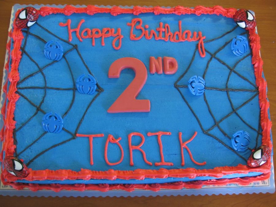 The top of the cake is a spiderweb. The cake is iced in blue with red trim.