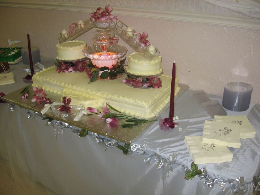 This cake was replicated from a photo. The bottom layer is 1 1/2 full sheet. The 2 tops cakes are 8" or can be dummy cakes and the step on the front of the cake is a dummy with the bride and groom's names written in buttercream.