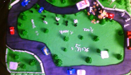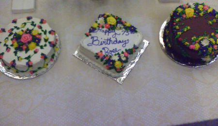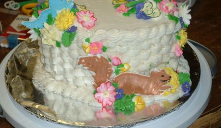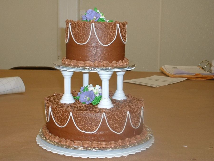 this is a chocolate cake with chocolate buttercream icing and filled with chocolate fudge... My husband and I just celebrated our 10th annaversary on the 4th of July and with class being on the 5th we decided to use this as our annaversary cake... it was a great hit with our children and grandkids.