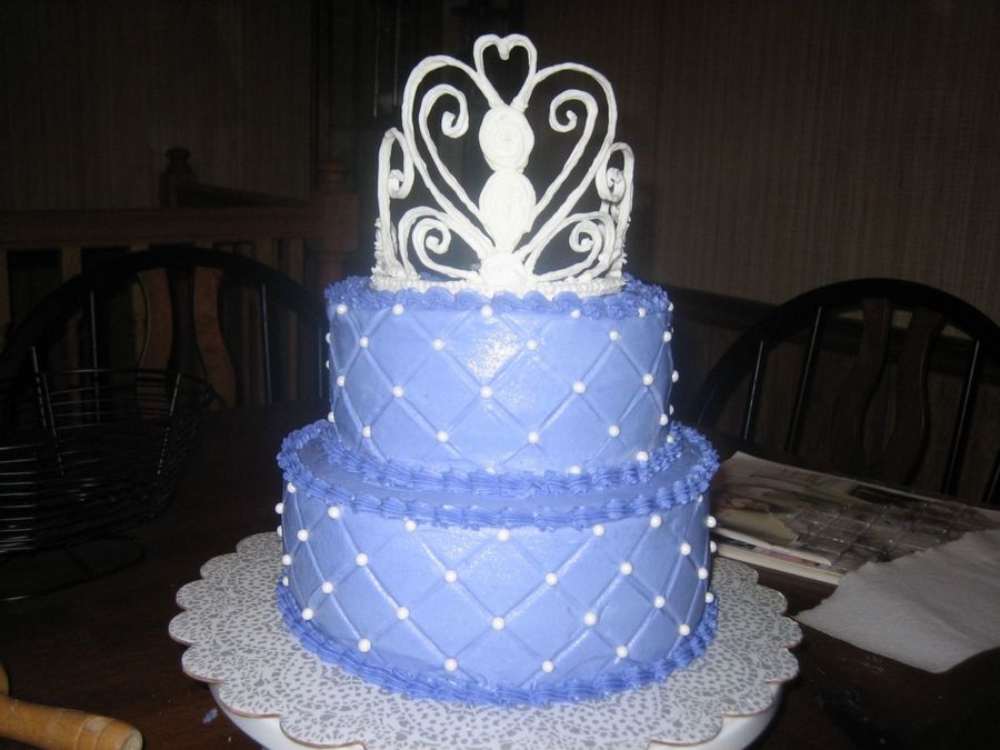 this is for my dd 4th birthday. bottom layer is french vanilla with lemon curd filling and top tier is chocolate.Frosted in purple(her favorite color)buttercream and used the diamond desigh on sides with edible pearls in the corners. princess crown is royal icing