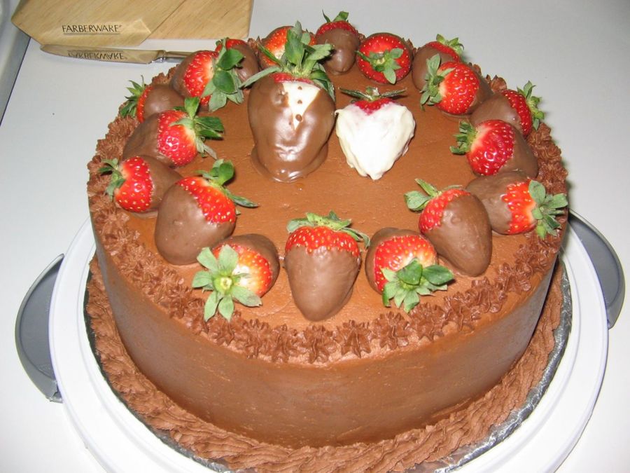 Chocolate cake, chocoate mocha filling, chocolate BC frosting and chocolate covered strawberrys on top.