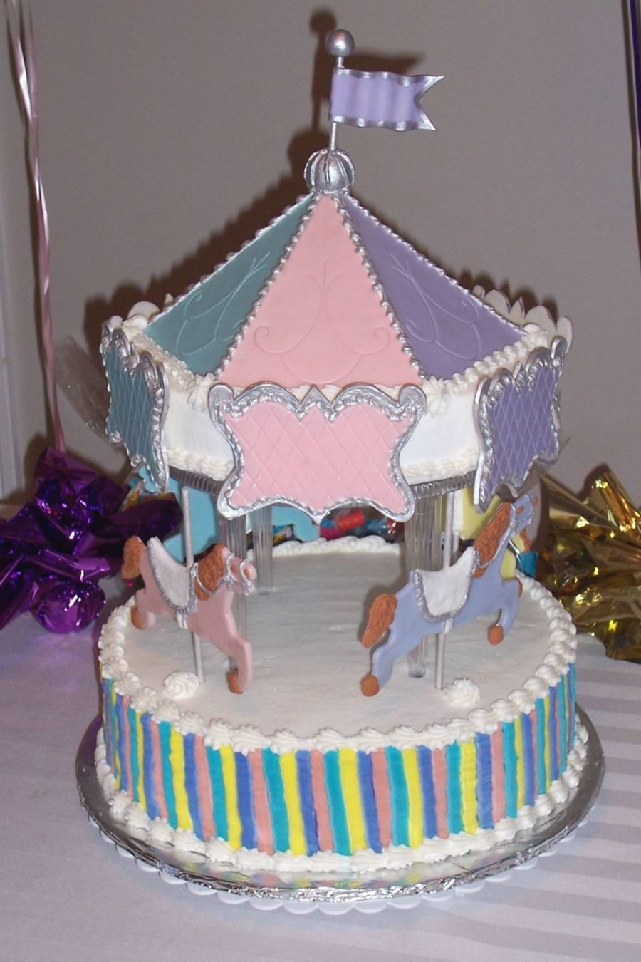 I did this cake for my 2 girls, who one has turned 2 and the other is turning 4. Both in the month of October. I decided on a carousel cake. I made the design myself. I used fondant icing to make the roof, horses, and the panels around the top cake. This is just a tiered cake with buttercream icing and silver luster dust accented on the roof and horses. It was alot of work, but I an very happy with the way it turned out.